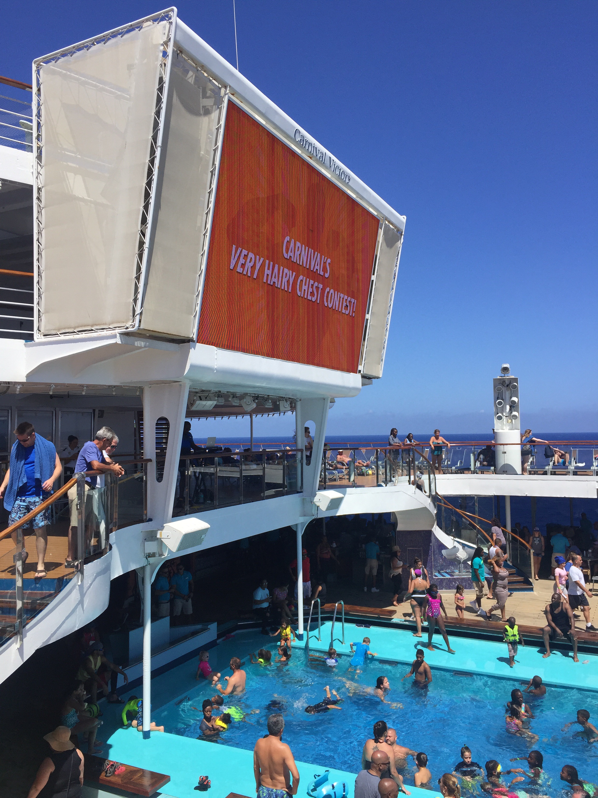 Zwischendurch gab es an Deck ein Unterhaltungsprogramm, z.B. The very hairy chest Contest. Ich (Sven) ging zwischendurch in unsere Kabine, da ich es in der Sonne nicht ewig aushielt und las ein Buch.