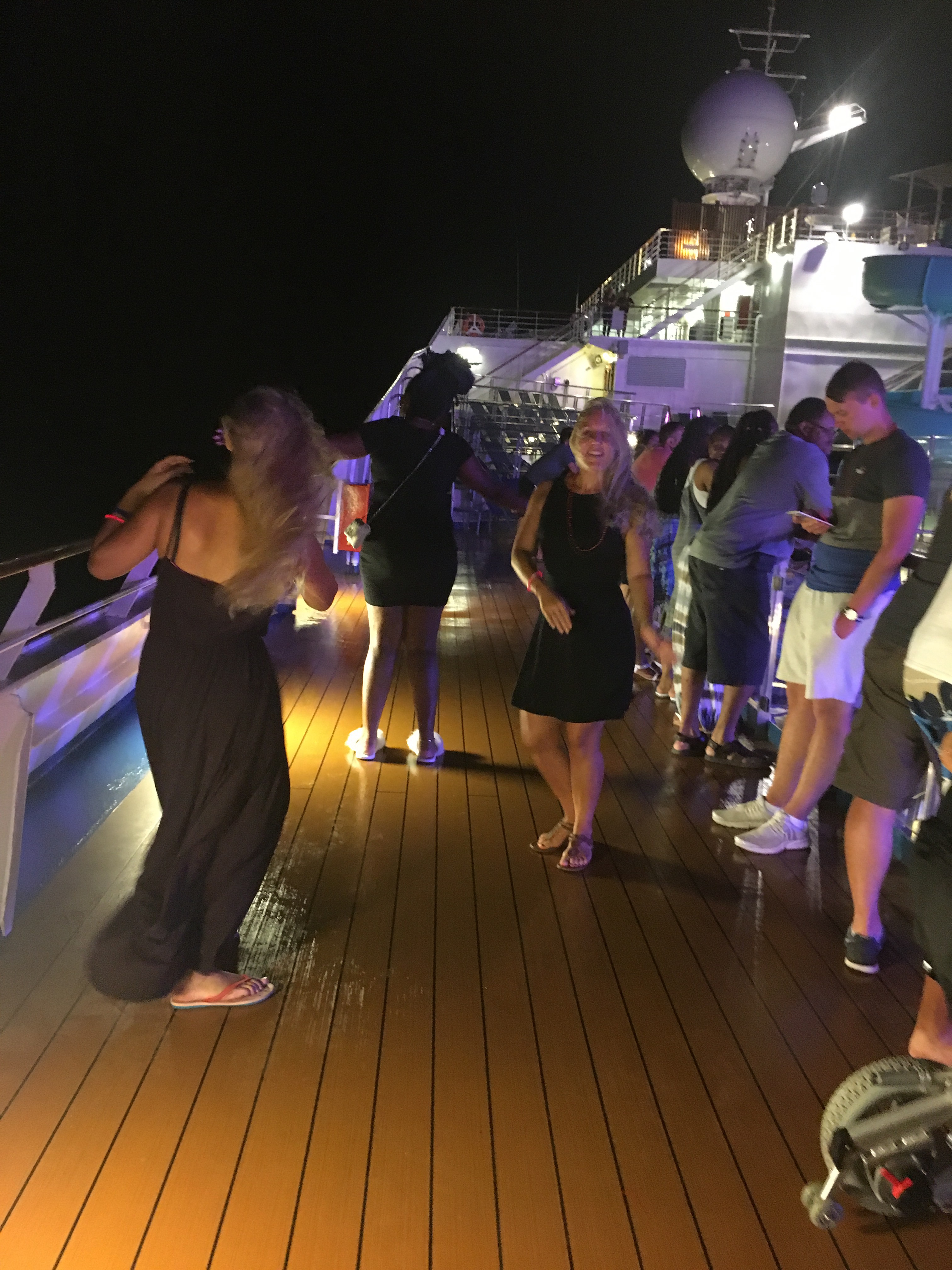 Am Abend sollten wir uns schick machen, denn der Dresscode für den Abend lautete „Cruise Elegant“. Also gingen wir in Kleidern und Hemden essen. Vorher fanden wir einen Raum, indem Karaoke gesungen wurde. Nach nicht mal 5 min. standen Dea und ich (Ami) auf der Bühne und sangen One Time von Justin Bieber. Unserem Publikum gefiel der Interpret nicht so…. Aber wir bekamen Applaus und es machte uns sehr viel Spaß. Das Essen war sehr lecker und plötzlich ertönte laute Musik und die Kellner fingen an zu tanzen. Das war echt richtig cool 🙂